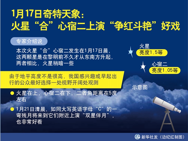 新華社天津1月15日電(記者周潤健)天文專家介紹,17日晨,火星“合”心宿二這一奇特天象將現身天宇。屆時,如果天氣晴好,我國感興趣的公眾可以看到這兩顆紅色的星星近距離爭輝,上演“爭紅斗艷”的好戲。