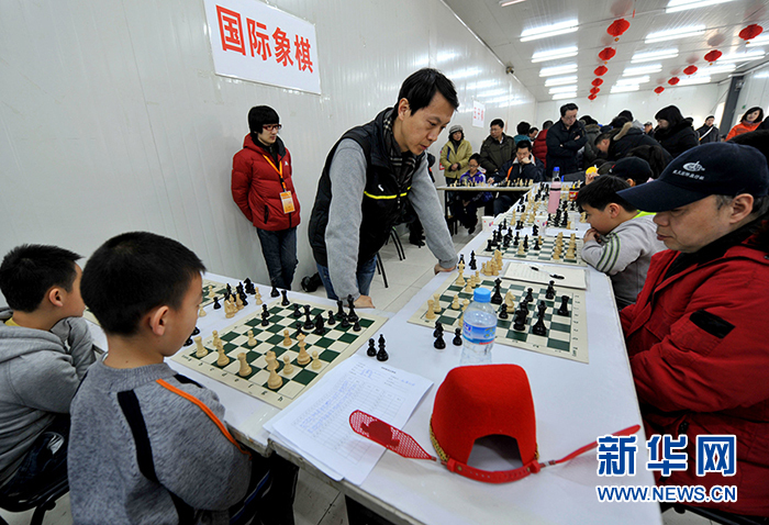 2013年2月13日,在北京龍潭廟會上,國際象棋大師李文良與多名業余棋手下棋。(圖片來源:新華社)