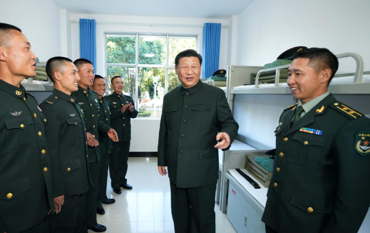 習近平十分牽掛我國邊防一線的守邊官兵。19日下午6時許,他來到駐守在我國西南邊陲的某邊防營視察,問住宿,看營衛生所,進食堂……了解戰士們的工作和生活情況。
