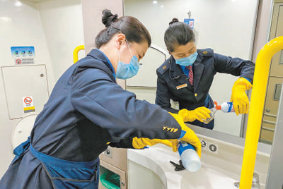 為應(yīng)對疫情,鐵路部門全力做好相關(guān)防控工作。圖為南昌開往南京的G1496次列車上,南昌客運(yùn)段工作人員認(rèn)真做好車廂清潔、消毒工作。鮑贛生攝(人民視覺)