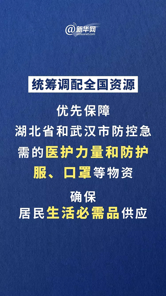 會議強調(diào),要突出重點,進(jìn)一步加強湖北省和武漢市疫情防控。中央向湖北派出指導(dǎo)組,推動加強防控一線工作。統(tǒng)籌調(diào)配全國資源,優(yōu)先保障湖北省和武漢市防控急需的醫(yī)護(hù)力量和防護(hù)服、口罩等物資,確保居民生活必需品供應(yīng),物資調(diào)運實行綠色通道。湖北省和武漢市要層層落實責(zé)任,加快建設(shè)集中收治醫(yī)院、改造酒店作為隔離區(qū),做好發(fā)熱病人及時診治,防范發(fā)生次生問題。加強醫(yī)護(hù)人員輪換和防護(hù),緩解他們的身體和心理壓力。嚴(yán)格做好城鄉(xiāng)結(jié)合部、省市邊界人流進(jìn)出管理,做到外防輸出、內(nèi)防擴(kuò)散。