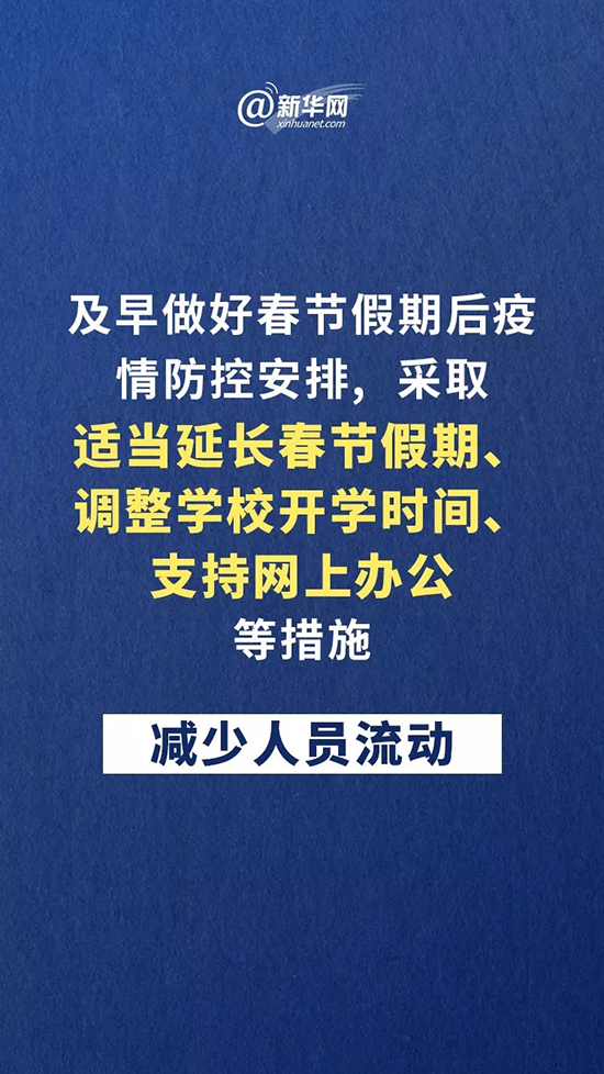 會議要求,要加強分類指導(dǎo),壓實屬地責(zé)任,精準(zhǔn)有效科學(xué)防控。各地要成立應(yīng)對疫情工作領(lǐng)導(dǎo)小組,黨政主要負(fù)責(zé)人要親自掛帥,防控工作不得有誤。加強疫情監(jiān)測,嚴(yán)格隔離確診患者,對疑似病例和密切接觸者要按醫(yī)學(xué)要求進(jìn)行隔離和檢查。發(fā)病人數(shù)較多城市要抓緊增加定點醫(yī)院、治療床位和隔離點。推遲、減少會議和大型活動。落實公共場所和交通工具檢控措施。農(nóng)村醫(yī)療衛(wèi)生條件薄弱,農(nóng)民工大批返鄉(xiāng),要高度重視農(nóng)村疫情防控,充分發(fā)揮基層組織和村醫(yī)作用,強化群防群控。及早做好春節(jié)假期后疫情防控安排,采取適當(dāng)延長春節(jié)假期、調(diào)整學(xué)校開學(xué)時間、支持網(wǎng)上辦公等措施,減少人員流動。嚴(yán)厲打擊防控物資囤積居奇等行為。各級財政要充分保障疫情防控、患者救治等經(jīng)費。