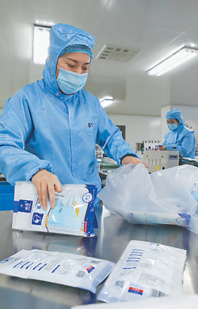 近日,各地口罩生產(chǎn)企業(yè)抓緊生產(chǎn),全力增加市場(chǎng)供應(yīng)。圖為浙江省德清縣一家口罩企業(yè)生產(chǎn)車間,工作人員在包裝口罩。王正 王玨 攝影報(bào)道(影像中國(guó))