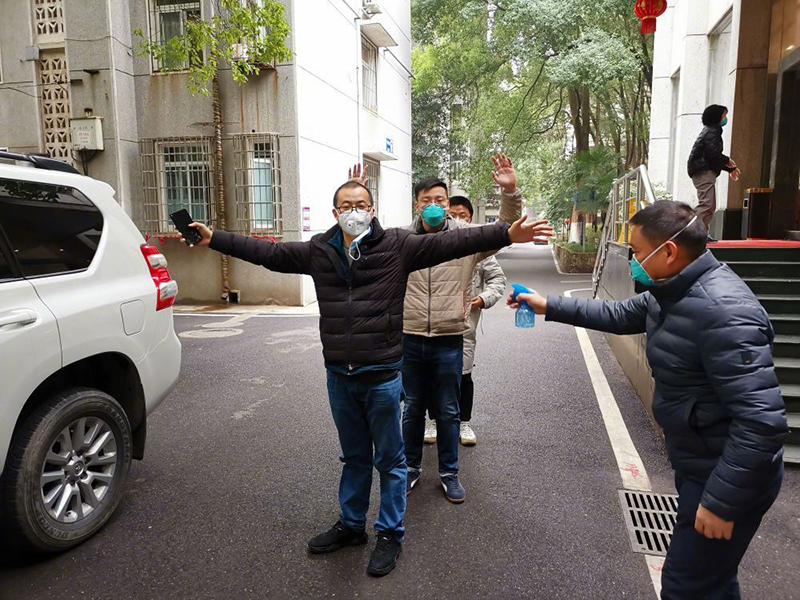 ↑ 2020年1月23日,新華社記者采訪結(jié)束后,用酒精進行人車消毒。