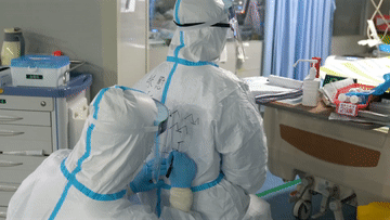穿上隔離服的醫(yī)護人員只能露出一雙眼睛,誰也認不出對方,于是他們進入隔離區(qū)的第一件事,就是相互在隔離服上寫下對方的名字或者外號,有時還會藝術(shù)創(chuàng)作一下,這成了隔離病房里“神秘的儀式”。