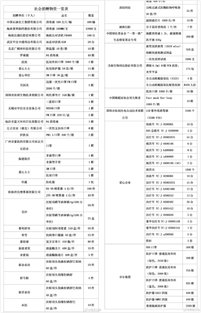 長安街知事(微信ID:Capitalnews)注意到,疫情發生以來,武漢紅十字會收到了大量社會捐贈款物,并分3期公布了相關清單。