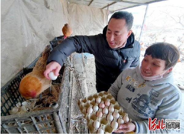國網(wǎng)饒陽縣供電公司駐豆村第一書記劉月倫(左)幫農(nóng)戶收雞蛋。 河北日報記者焦磊攝