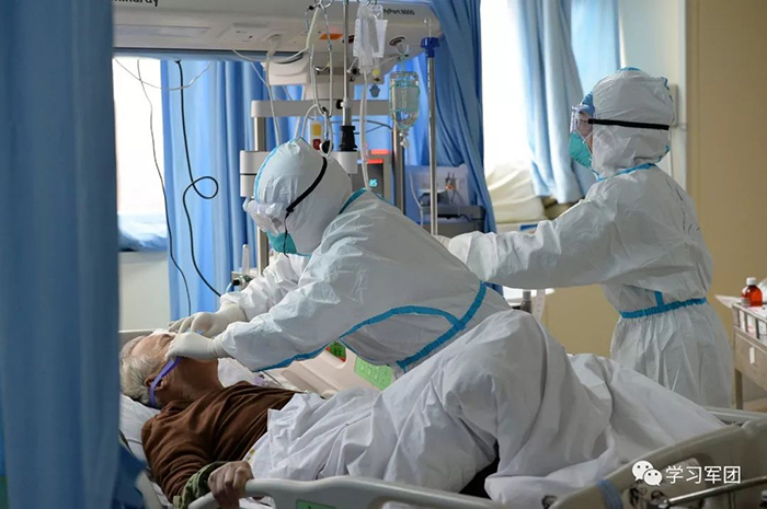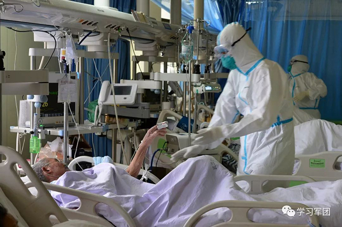 1月27日上午,海軍軍醫(yī)大學醫(yī)療隊醫(yī)護人員在漢口醫(yī)院重癥監(jiān)護室對新型冠狀病毒感染的肺炎患者進行救治。醫(yī)護人員對患者進行輸液護理。解放軍報記者范顯海攝