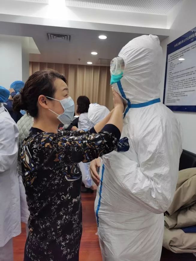 (圖說:出發前,首都醫科大學宣武醫院在全員培訓的基礎上,對醫護人員進行穿脫防護服等感染防控加強培訓。在現場,首都醫科大學宣武醫院呼吸科副主任醫師肖漢(右),他的愛人北京醫院醫務處副處長潘琪(左)正在用自己的專業知識,幫助丈夫規范穿戴防護服。)