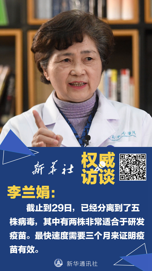 李蘭娟:研發(fā)疫苗第一步是要獲得病毒株。目前,我們已經(jīng)分離到了五株病毒,其中有兩株非常適合于研發(fā)疫苗。分離到種子株之后,還要把種子株的病毒在細(xì)胞中培養(yǎng),讓它長到一定的量,這就需要一個(gè)多月。大量的細(xì)胞病毒拿到了,還要進(jìn)行滅活,并對它的免疫原性如何,能不能預(yù)防、有沒有效果、有沒有毒力、會(huì)不會(huì)造成新的感染等開展實(shí)驗(yàn)。