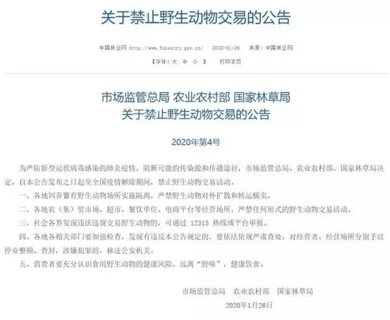 為此,國家市場監(jiān)管總局、農(nóng)業(yè)農(nóng)村部、國家林業(yè)和草原局26日聯(lián)合發(fā)布公告要求,即日起至全國疫情解除期間,禁止野生動物交易活動,以斬斷病毒的傳染源和傳播途徑。