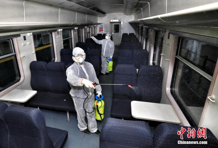2月2日,中國(guó)鐵路烏魯木齊局集團(tuán)有限公司疾控中心消殺科站車消殺隊(duì)對(duì)車體內(nèi)對(duì)坐席噴灑消毒液。中新社發(fā) 擺風(fēng)亮 攝