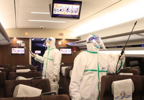 2月4日,中國(guó)鐵路北京局集團(tuán)有限公司對(duì)返回北京動(dòng)車(chē)段的復(fù)興號(hào)進(jìn)行車(chē)內(nèi)消毒作業(yè)。張晴/攝