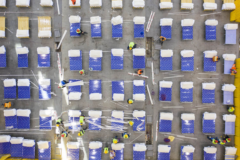 2月4日,改造中的武漢客廳內部,它將被改造成為一所“方艙醫院”,以收治新型冠狀病毒感染的肺炎輕癥患者為主。