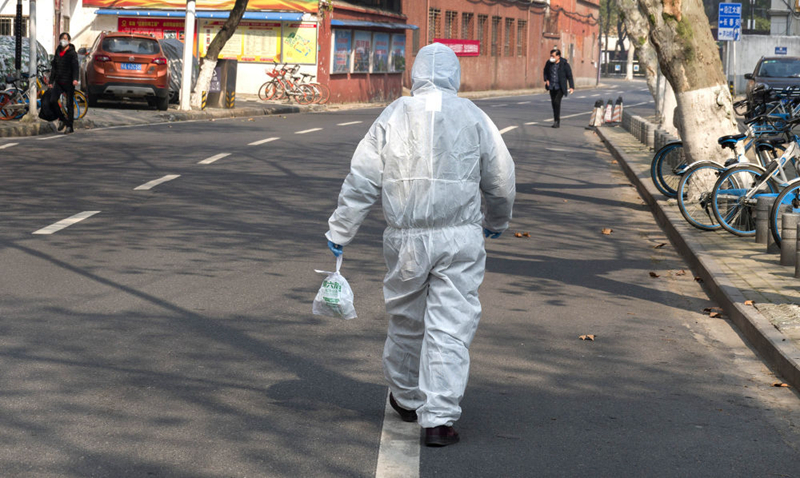 在武漢市江岸區永清街道吉林社區采訪時,我遇到了社區的工作人員張敏,她負責給社區里隔離的老人病患送藥、送菜、送食品。她穿著防護服,戴著防護眼鏡。
