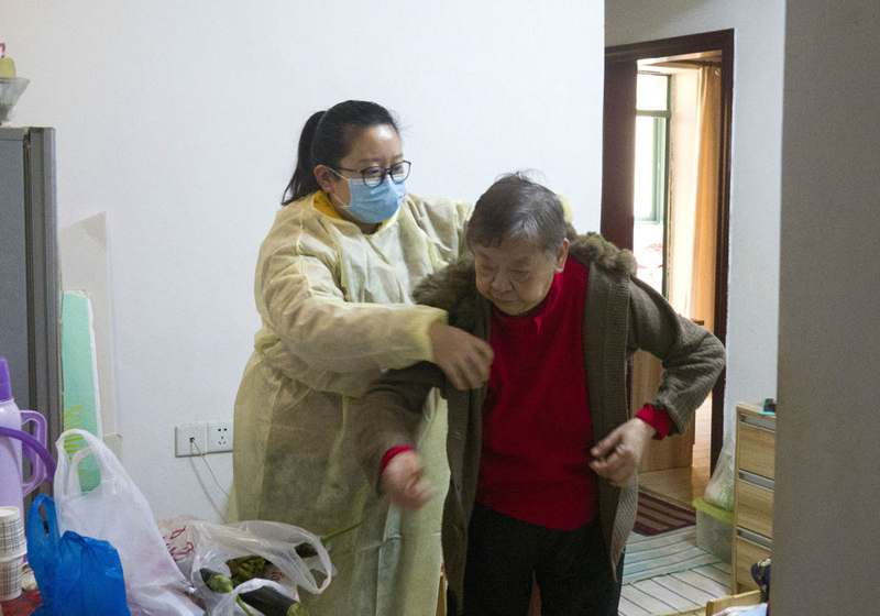 2月5日,武漢市江岸區永清街道吉林社區工作人員張敏為老伴住院的獨居老人送藥。