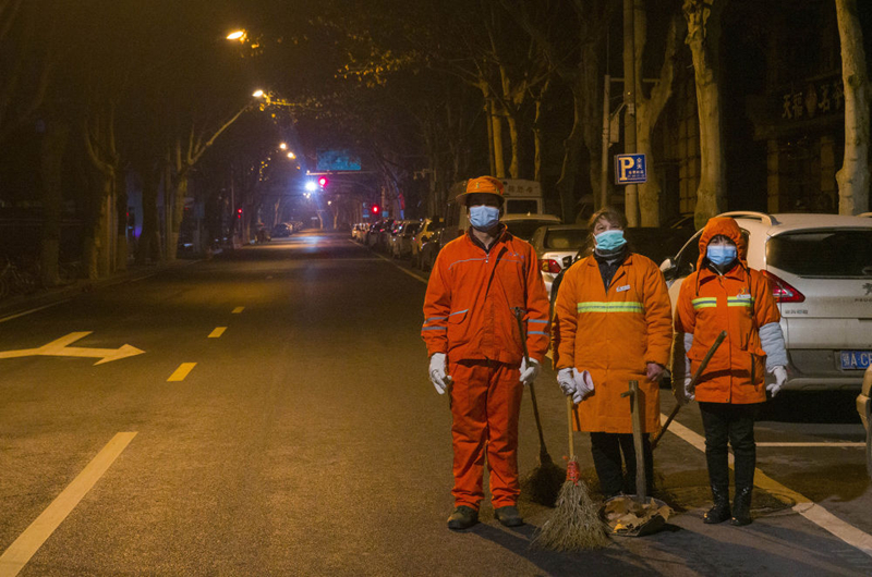 2月3日清晨,三位堅守崗位的環衛工人。