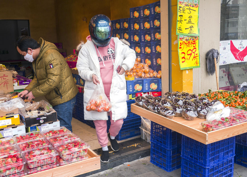 2月8日,在武漢市江漢區,一名女子外面戴著摩托車頭盔,里面戴著口罩在水果店采購。