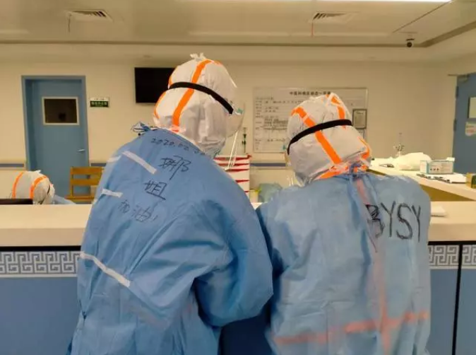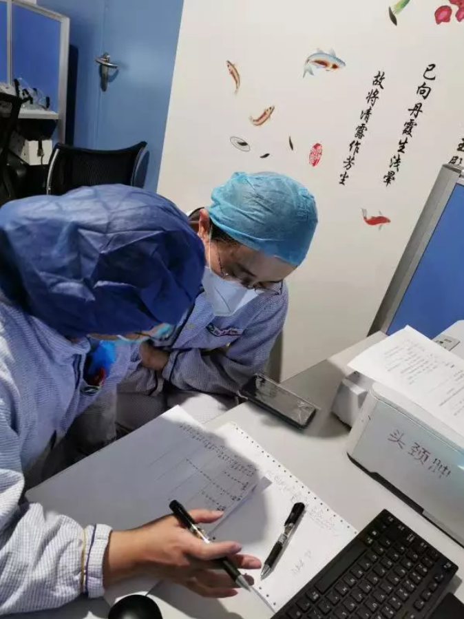 啟用危重癥新病房的第一天,姝姐上了一個(gè)“24小時(shí)白連夜班”。第一位來診的是個(gè)危重患者,姝姐主動(dòng)請纓:“來,我收這個(gè)病人。”凌晨3點(diǎn),到了該下班的時(shí)間,姝姐還在寫病歷,她說污染區(qū)的護(hù)士還沒換好衣服,“等她們出來,我再結(jié)束工作,我們一起離開”。而這一等又是一個(gè)小時(shí)……下午15點(diǎn)到21點(diǎn)又輪到北醫(yī)三院隊(duì)員們上崗了,她再次主動(dòng)請纓參加工作,我有些擔(dān)心她的身體會(huì)吃不消,本想勸阻一下,誰知她微微一笑說:“你姝姐有啥不行的!”直到22點(diǎn)30,姝姐才從隔離病房出來,口罩和眼罩已經(jīng)壓紅了鼻梁,衣服早已被汗水浸濕了,可她仍然面帶著微笑。