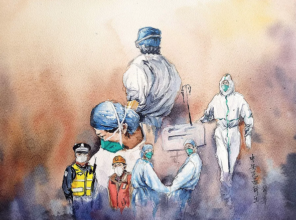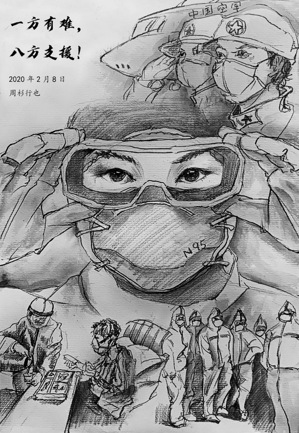 素描畫《一方有難,八方支援!》作者:中央芭蕾舞團(tuán)燈光設(shè)計(jì) 周杉行也
