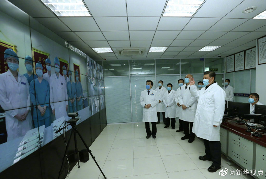 10日下午,習近平來到北京地壇醫院,察看新冠肺炎感染者住院診療情況,視頻連線武漢市重癥患者收治醫院,聽取中央指導組、湖北指揮部有關情況匯報,慰問奮戰在一線的醫務工作者。隨后,習近平前往朝陽區疾病預防控制中心,了解朝陽區開展應急處置、流行病學調查、篩查報告和北京市疫情防控工作情況。(文字記者張曉松 攝影記者鞠鵬、謝環馳、劉彬)?