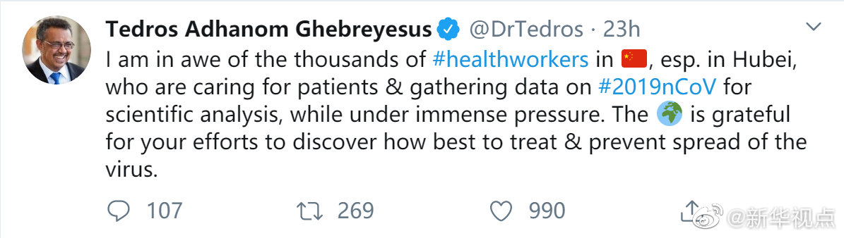 世界衛(wèi)生組織總干事向抗擊新冠肺炎疫情的中國(guó)醫(yī)護(hù)人員致敬-新華網(wǎng)