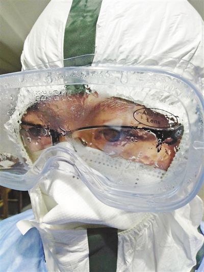 9日,國(guó)家緊急醫(yī)學(xué)救援隊(duì)(海南)隊(duì)員、海南醫(yī)學(xué)院第一附屬醫(yī)院醫(yī)生程少文承擔(dān)武漢國(guó)際會(huì)展中心方艙醫(yī)院的值班任務(wù),不到兩小時(shí)護(hù)目鏡上的霧氣就形成了大片積水。國(guó)家緊急醫(yī)學(xué)救援隊(duì)(海南)供圖