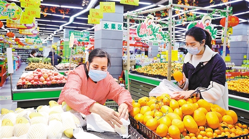 2月10日,市民在江西省宜豐縣華聯(lián)超市選購水果。連日來,該縣加強物資統(tǒng)籌調(diào)配,確保物價穩(wěn)定。 何賤來攝(中經(jīng)視覺)