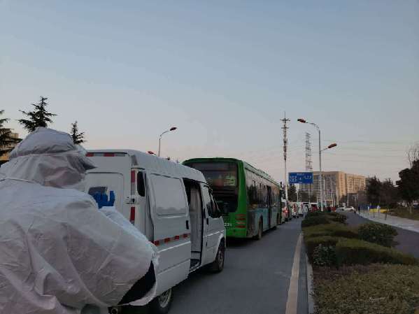 各個(gè)街道轉(zhuǎn)運(yùn)病人的車輛排成長龍