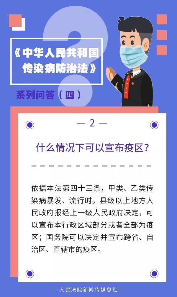 當前,新型冠狀病毒感染肺炎疫情蔓延,正嚴重影響著社會正常生產生活秩序。傳染病防治關系到每一個人的生命健康。面對傳染病的肆虐,如何利用法律武器來抗擊疫情?您對傳染病防治法知多少?小編將為您作出系列介紹。今天推出系列問答之四,敬請關注!