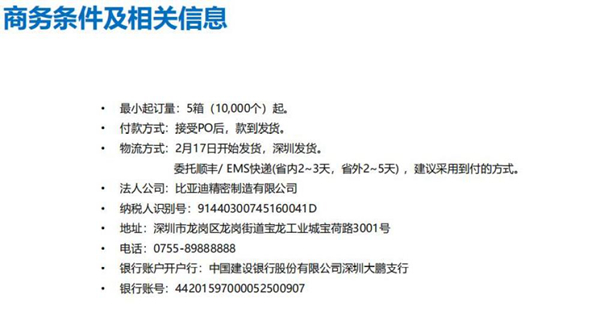 與此同時,《比亞迪賣口罩了》pdf文件也在網上流傳,文件內容顯示,口罩制造的法人公司為比亞迪精密制造有限公司,最小起訂量為5箱(10000個)起,2月17日開始從深圳發貨??爝f委托順豐/ EMS快遞(省內2-3天,省外2-5天) 。