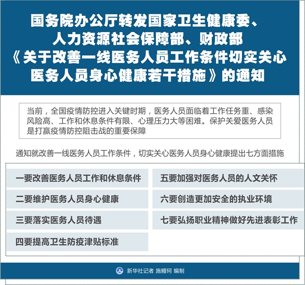 通知就改善一線醫(yī)務人員工作條件,切實關心醫(yī)務人員身心健康提出七方面措施。一要改善醫(yī)務人員工作和休息條件。加強醫(yī)務人員職業(yè)暴露的防護設施建設和設備配置,重點改造醫(yī)生辦公室、值班室和休息室。為醫(yī)務人員提供良好后勤服務,保障醫(yī)務人員充足的睡眠和飲食。二要維護醫(yī)務人員身心健康。合理安排醫(yī)務人員作息時間。對于因執(zhí)行疫情防控不能休假的醫(yī)務人員,在防控任務結束后,由所在醫(yī)療衛(wèi)生機構優(yōu)先安排補休。允許需要緊急補充醫(yī)護人員等疫情防控工作人員的相關醫(yī)療衛(wèi)生機構簡化招聘程序。加強醫(yī)務人員個人防護,組織做好一線醫(yī)務人員健康體檢,最大限度減少院內(nèi)感染。加強心理危機干預和心理疏導,減輕醫(yī)務人員心理壓力。三要落實醫(yī)務人員待遇。為疫情防控一線醫(yī)務人員和防疫工作者發(fā)放臨時性工作補助。向防控任務重、風險程度高的醫(yī)療衛(wèi)生機構核增不納入基數(shù)的一次性績效工資總量。開通醫(yī)務人員工傷認定綠色通道。四要提高衛(wèi)生防疫津貼標準。出臺提高衛(wèi)生防疫津貼標準的政策。對參與新冠肺炎疫情防疫人員,要及時足額發(fā)放到位。五要加強對醫(yī)務人員的人文關懷。動員組織社會力量,對一線醫(yī)務人員展開慰問。為一線醫(yī)務人員和家屬建立溝通聯(lián)絡渠道。對家庭困難的一線醫(yī)務人員家屬進行對口幫扶。六要創(chuàng)造更加安全的執(zhí)業(yè)環(huán)境。嚴格落實各項安全防范措施,加大警力投入,完善問責機制,對發(fā)現(xiàn)有歧視孤立一線醫(yī)務人員及其家屬行為的,要及時進行批評教育,情節(jié)嚴重的依法予以處理。對傷害醫(yī)務人員的,要堅決依法嚴肅查處。七要弘揚職業(yè)精神做好先進表彰工作。做好及時獎勵和及時性表彰工作,為做好疫情防控工作增強信心、凝聚力量。