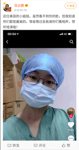 這兩天,相聲演員岳云鵬發的微博火了。原來是前線的一位護士在社交媒體平臺發文稱,等疫情結束想去德云社看演出。岳云鵬看到后在微博暖心回復稱:這位美麗的小姐姐,雖然看不到你的臉,但我知道你們都是最美的。等疫情過去我請你們看相聲,想聽啥演啥!