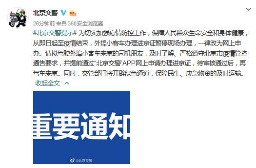 據北京市公安局公安交通管理局微博消息,為切實加強疫情防控工作,保障人民群眾生命安全和身體健康,從2月17日起至疫情結束,外埠小客車辦理進京證暫停現場辦理,一律改為網上申辦。