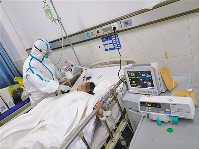 醫(yī)護人員正在為確診患者治療。荊州市胸科醫(yī)院供圖