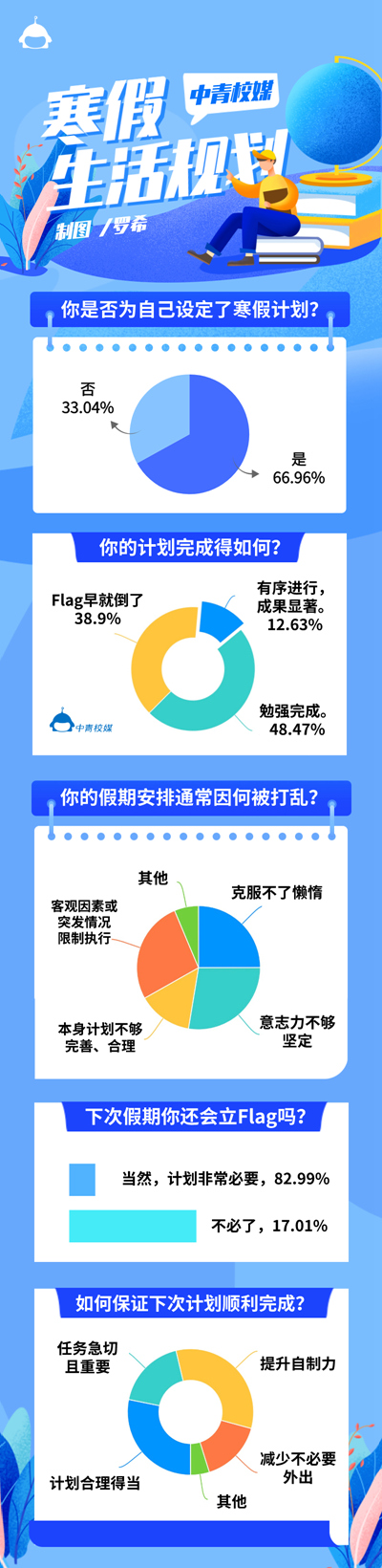 中青校媒調(diào)查顯示,在落實(shí)假期計劃時,意志力不夠堅定(63.19%)、客觀因素或者突發(fā)情況(62.36%)、克服不了懶惰(57.88%)、計劃本身不夠合理(33.06%) 等因素都會干擾計劃的執(zhí)行。