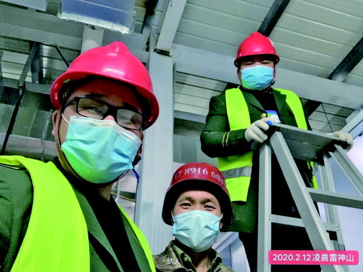 圖為2月12日李海軍(中)在雷神山醫院工地留影。新華社發(受訪者李海軍供圖)