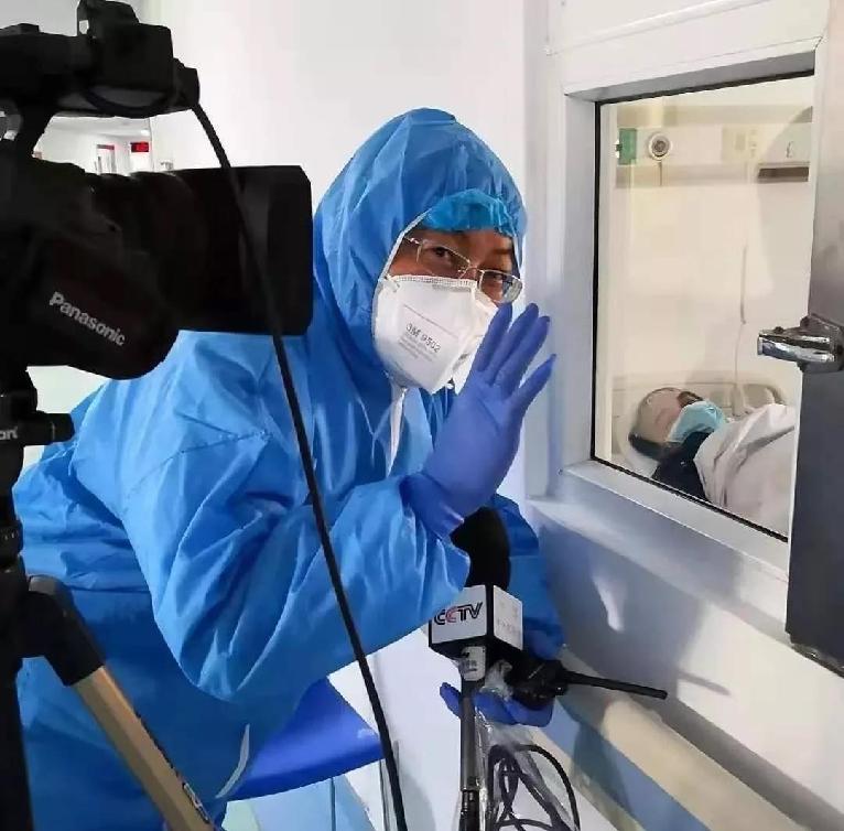 中央廣播電視總臺記者蔣曉平在武漢市金銀潭醫院采訪。