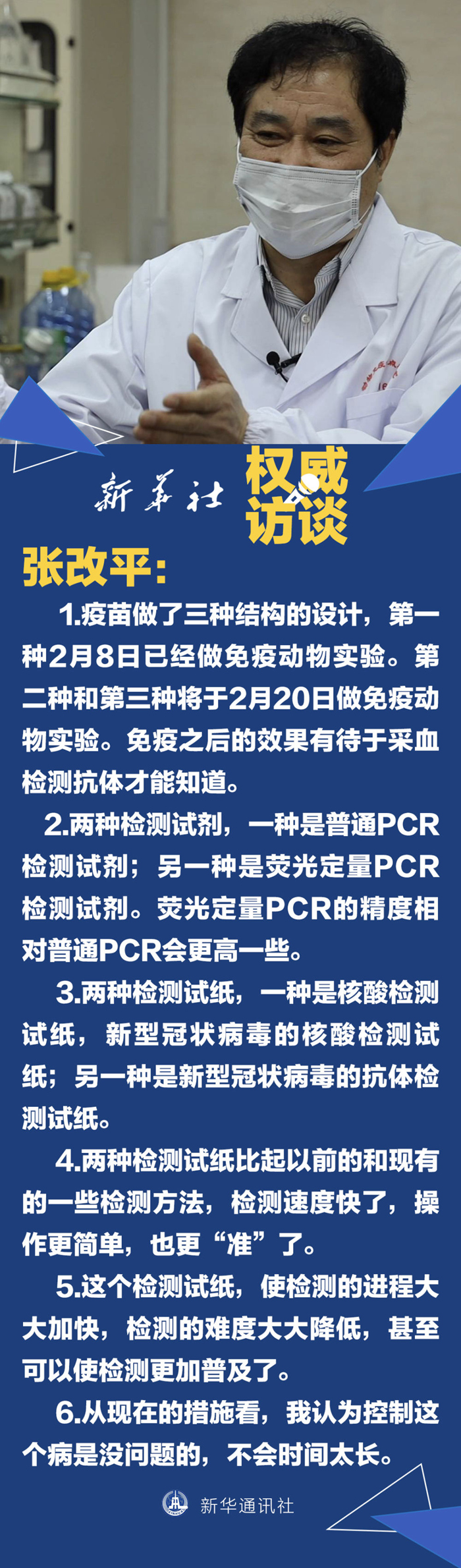 這些階段性研究成果是什么?三分鐘就可快速檢測新冠病毒的檢測試紙準確率有多高?新冠病毒疫苗抗原的動物試驗效果如何?什么時間能夠推廣應用?圍繞這些問題,新華社記者2月18日專訪了張改平院士。