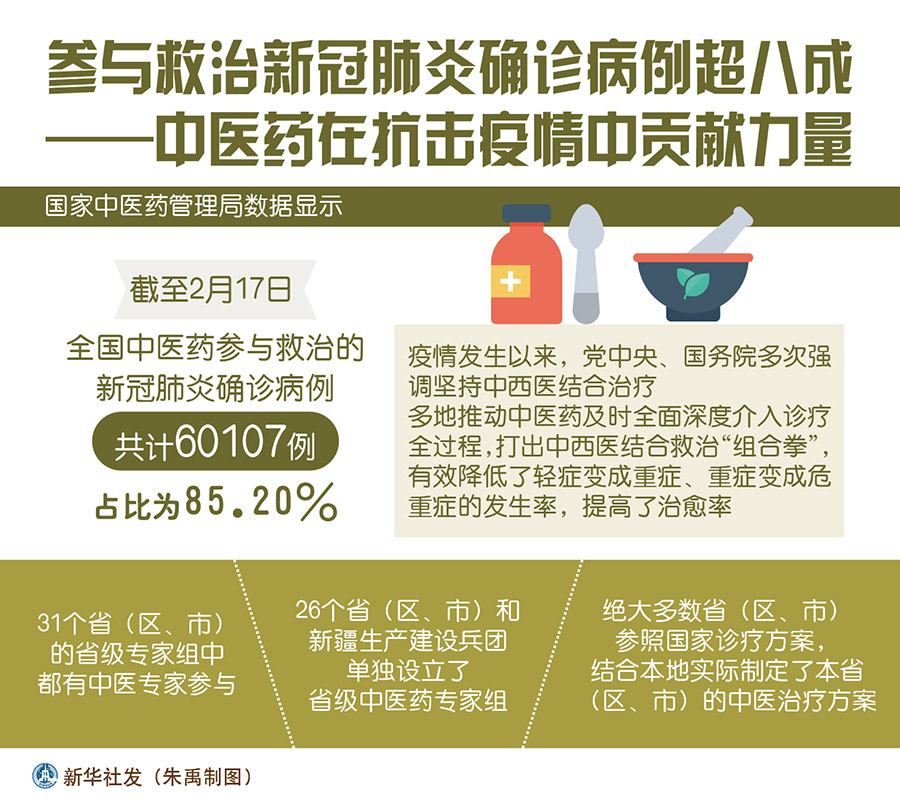 新華社北京2月20日電 題:參與救治新冠肺炎確診病例超八成——中醫藥在抗擊疫情中貢獻力量