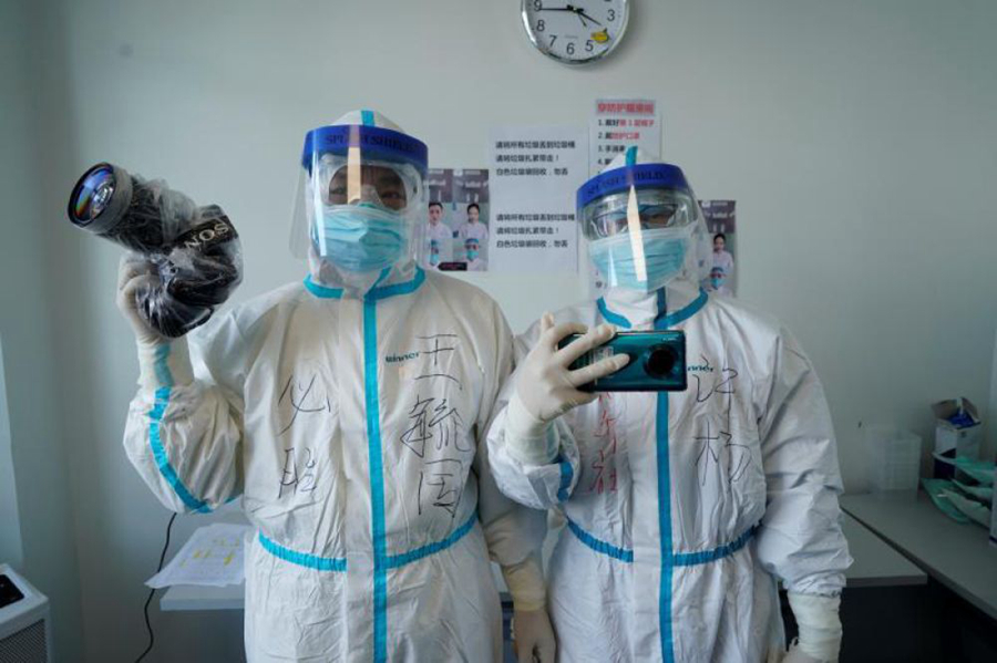 2月18日,新華社記者王毓國(guó)(左)、許楊在華中科技大學(xué)同濟(jì)醫(yī)院中法新城院區(qū)準(zhǔn)備進(jìn)入隔離病房?jī)?nèi)采訪(fǎng)。新華社記者 余國(guó)慶 攝