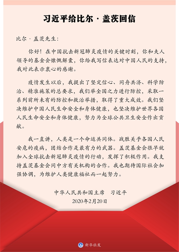 新華社北京2月22日電? 國家主席習近平2月20日給美國蓋茨基金會聯席主席比爾·蓋茨回信,感謝他和蓋茨基金會對中國防控新冠肺炎疫情工作的支持,呼吁國際社會加強協調、共同抗擊疫情。