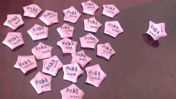 住進武漢江夏區方艙醫院的輕癥患者不得不與家人隔離,不能出門活動,在初春的戶外仰望星空,暫時只能是一個愿望。2月20日的夜晚,夜班護士卻把“星星”帶進了“方艙”!南京市中西醫結合醫院的護士王慧敏上班時,向每一位患者贈送了一個自己親手疊的許愿星,每一個“星星”都寫上了祝福的話語:“叔叔阿姨晚上好,這是我自己做的許愿星,祝愿你們早日康復!”