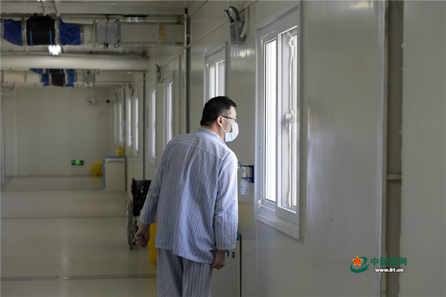 萬先生從窗口望向窗外,在病房,他期待自己早日康復出院。中國軍網記者范顯海 攝
