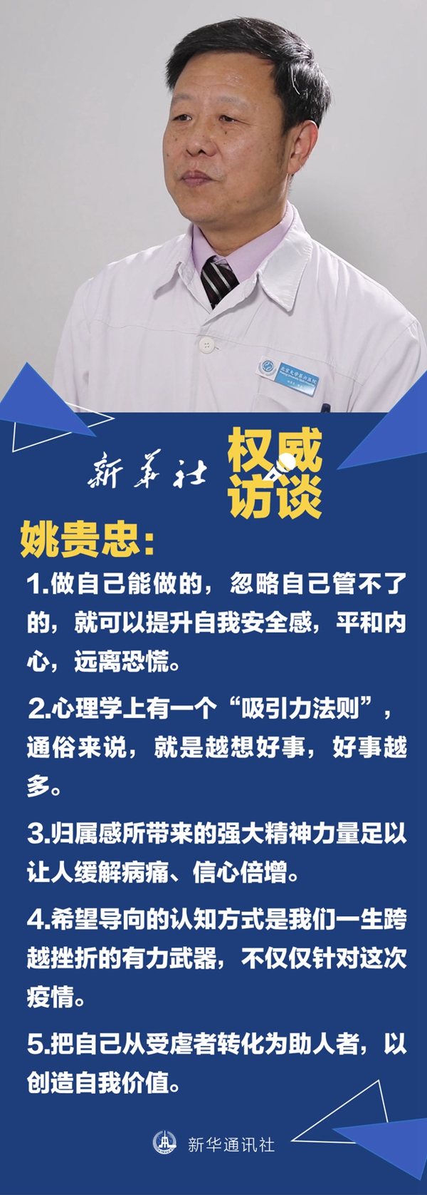 姚貴忠:在災(zāi)難面前,人容易想到不好的事。可是,越是在這個(gè)時(shí)候越應(yīng)該看到希望,生活才有動(dòng)力。疫情是一場(chǎng)危機(jī),我們可以正性地看危難之中的機(jī)會(huì)。突如其來的疫情是考驗(yàn)我們對(duì)生活變故適應(yīng)力的機(jī)會(huì),是與家人心無旁騖團(tuán)聚的機(jī)會(huì),是有足夠閑暇關(guān)愛自己的機(jī)會(huì),是靜下心來反思人生、蓄勢(shì)再發(fā)的機(jī)會(huì)。機(jī)會(huì)中孕育希望,希望中又給自己補(bǔ)充能量。