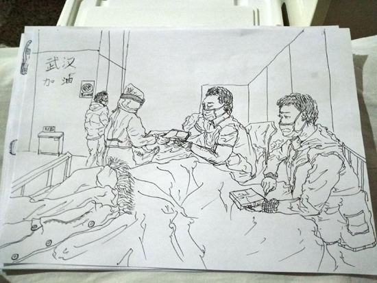 他把畫的“方艙生活”發(fā)到了微博上——兩位病人在床,護(hù)士俯身照顧。畫中醫(yī)院的墻上被他特意寫了四個(gè)字:“武漢加油。”(程盟超)