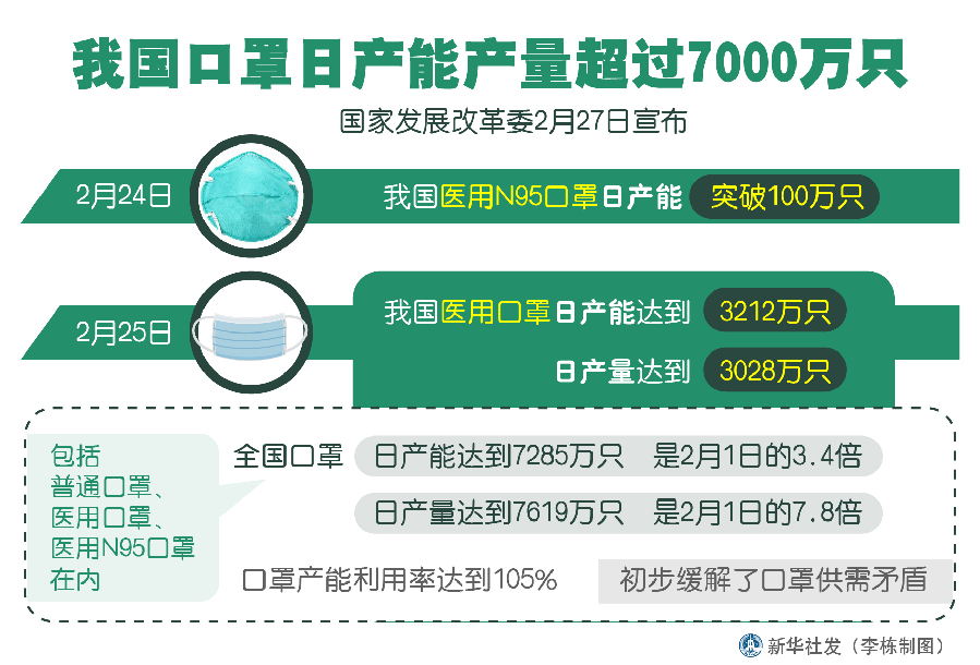 新華社北京2月27日電(記者安蓓)國家發展改革委27日宣布,繼2月24日我國醫用N95口罩日產能突破100萬只后,2月25日,我國醫用口罩日產能達到3212萬只,日產量達到3028萬只;包括普通口罩、醫用口罩、醫用N95口罩在內,全國口罩日產能達到7285萬只,日產量達到7619萬只,分別是2月1日的3.4倍、7.8倍,口罩產能利用率達到105%,初步緩解了口罩供需矛盾。