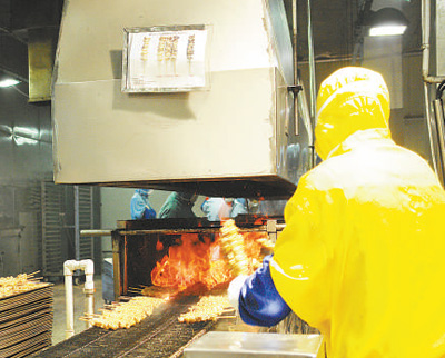 測體溫、登記、換服裝、消毒,走進沈陽華美食品有限公司的熟食加工車間,只見已經啟動的3條生產線正有條不紊運行,300多名工人忙著給雞肉穿串、炭烤、蒸煮、速凍、包裝……一袋袋熟食“新鮮出爐”,被送入冷庫。