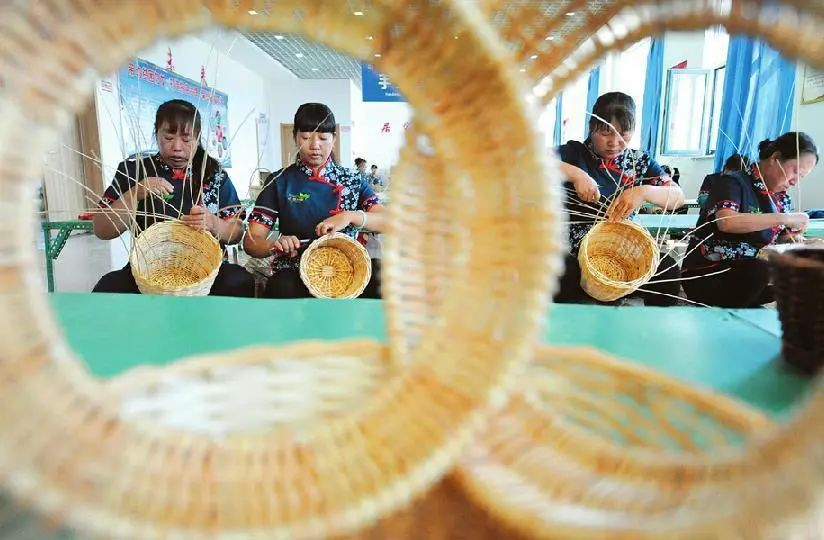 資料圖。廣靈縣農(nóng)民編織技工正在編織柳條插花籃 來源:山西日報