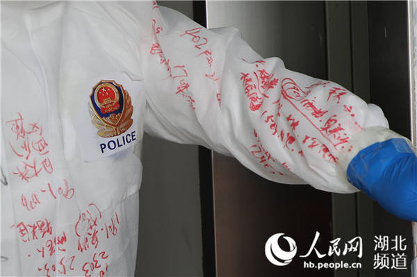 穿著這件“絕版防護(hù)服”的,正是湖北荊州市公安局沙市區(qū)分局勝利街派出所所長代睿。“護(hù)目鏡起霧視線模糊,又怕漏掉居民的需求,只好寫在防護(hù)服上。我的手臂上寫的都是急需的藥品等物資,胸前和腿上寫的是急需的生活用品。”代睿說,這樣記錄方便也能看的清。